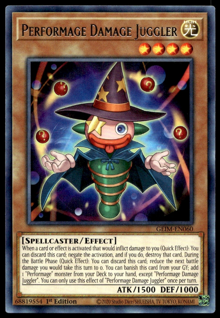 This card, from 2020 is part of the Yu-Gi-Oh! Genesis Impact (1st Edition) card set. Performage Damage Juggler is featured and has a card number of GEIM-EN060.