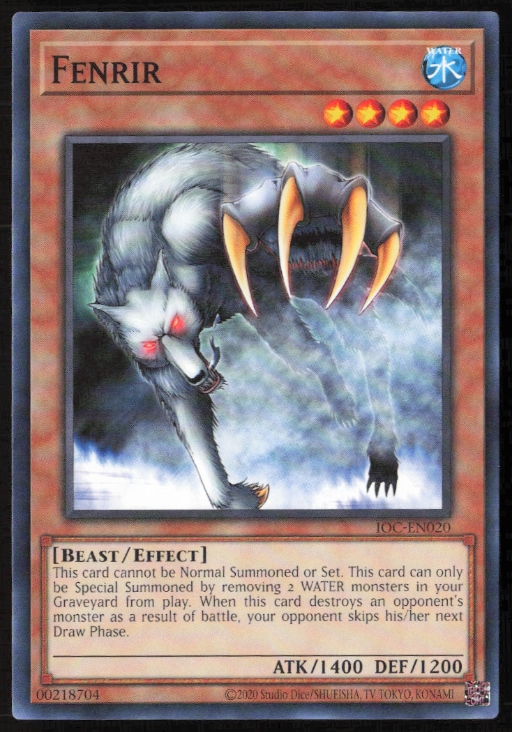 This Yu-Gi-Oh! card, from 2023 is part of the Yu-Gi-Oh! Invasion of Chaos (25th Anniversary Edition) card set. Fenrir is featured and has a card number of IOC-EN020.