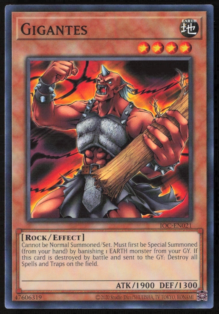 This Yu-Gi-Oh! card, from 2023 is part of the Yu-Gi-Oh! Invasion of Chaos (25th Anniversary Edition) card set. Gigantes is featured and has a card number of IOC-EN021.