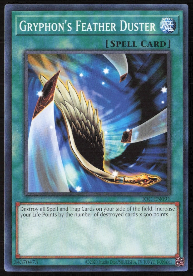 This Yu-Gi-Oh! card, from 2023 is part of the Yu-Gi-Oh! Invasion of Chaos (25th Anniversary Edition) card set. Gryphon’s Feather Duster is featured and has a card number of IOC-EN091.