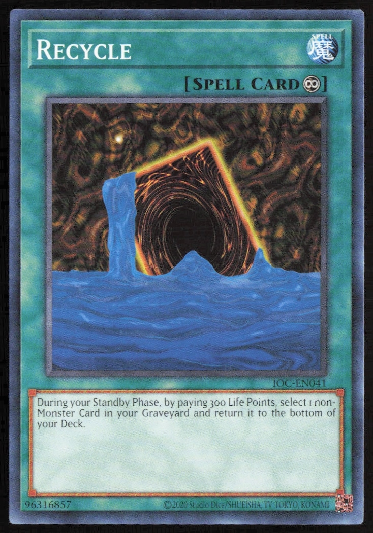 This Yu-Gi-Oh! card, from 2023 is part of the Yu-Gi-Oh! Invasion of Chaos (25th Anniversary Edition) card set. Recycle is featured and has a card number of IOC-EN041.