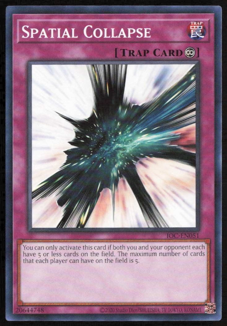 This Yu-Gi-Oh! card, from 2023 is part of the Yu-Gi-Oh! Invasion of Chaos (25th Anniversary Edition) card set. Spatial Collapse is featured and has a card number of IOC-EN051.