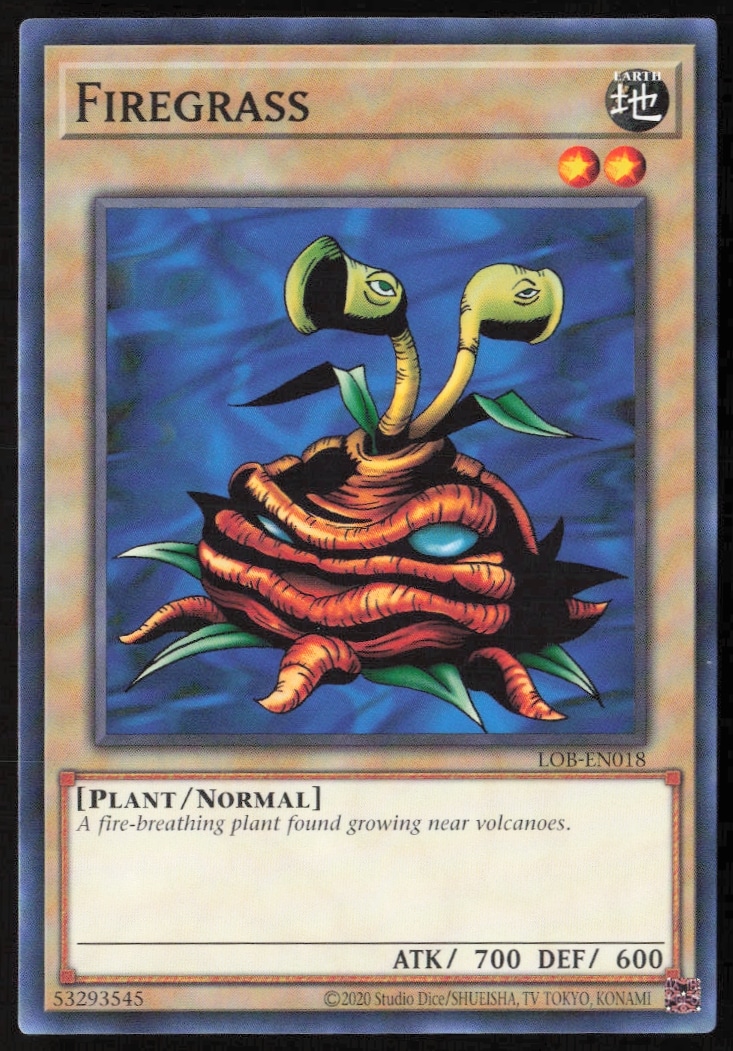 This Yu-Gi-Oh! card, from 2023 is part of the Yu-Gi-Oh! Legend of Blue Eyes White Dragon (25th Anniversary Edition) card set. Firegrass is featured and has a card number of LOB-EN018.