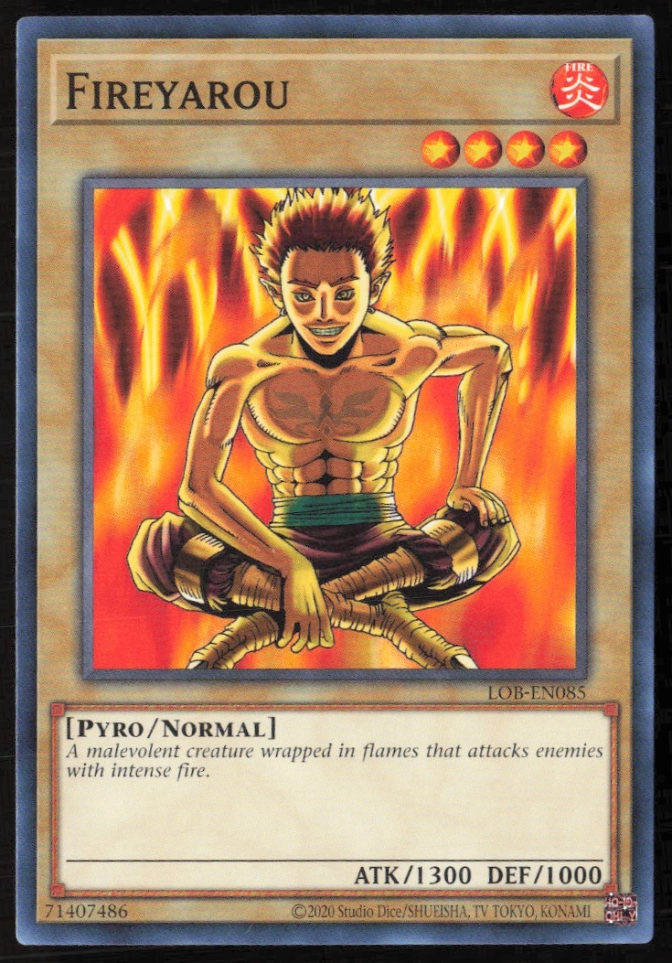 This Yu-Gi-Oh! card, from 2023 is part of the Yu-Gi-Oh! Legend of Blue Eyes White Dragon (25th Anniversary Edition) card set. Fireyarou is featured and has a card number of LOB-EN085.