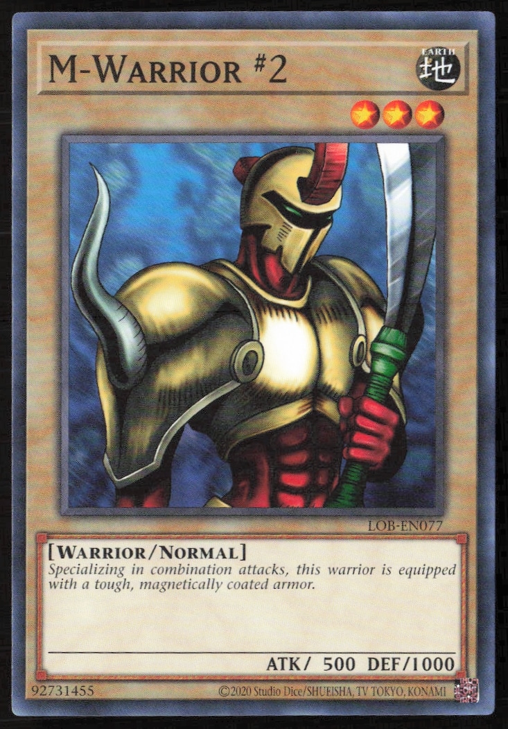 This Yu-Gi-Oh! card, from 2023 is part of the Yu-Gi-Oh! Legend of Blue Eyes White Dragon (25th Anniversary Edition) card set. M-Warrior #2 is featured and has a card number of LOB-EN077.
