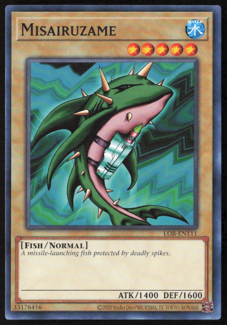 This Yu-Gi-Oh! card, from 2023 is part of the Yu-Gi-Oh! Legend of Blue Eyes White Dragon (25th Anniversary Edition) card set. Misairuzame is featured and has a card number of LOB-EN111.