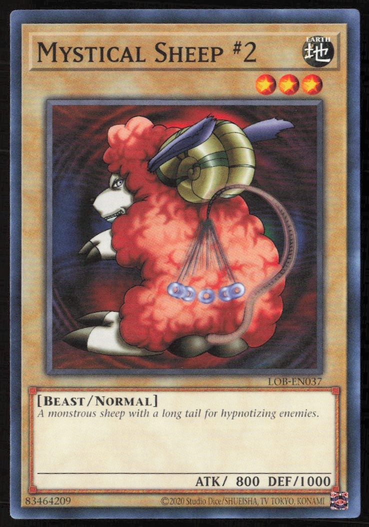 This Yu-Gi-Oh! card, from 2023 is part of the Yu-Gi-Oh! Legend of Blue Eyes White Dragon (25th Anniversary Edition) card set. Mystical Sheep is featured and has a card number of LOB-EN037.