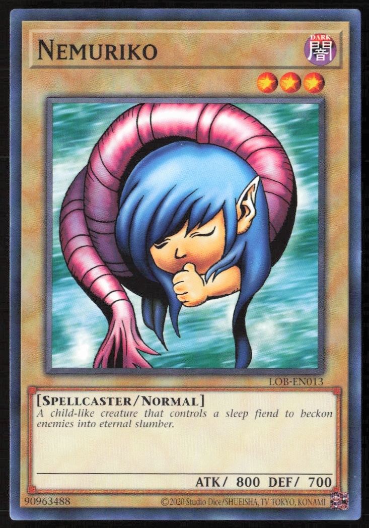 This Yu-Gi-Oh! card, from 2023 is part of the Yu-Gi-Oh! Legend of Blue Eyes White Dragon (25th Anniversary Edition) card set. Nemuriko is featured and has a card number of LOB-EN013.