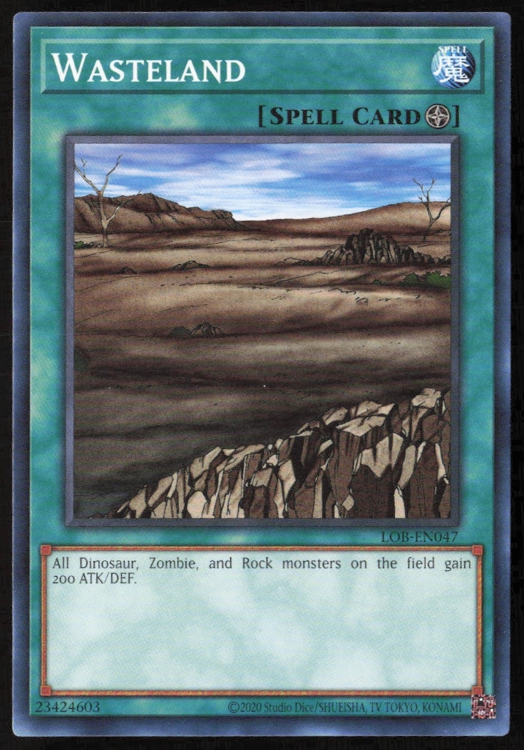 This Yu-Gi-Oh! card, from 2023 is part of the Yu-Gi-Oh! Legend of Blue Eyes White Dragon (25th Anniversary Edition) card set. Wasteland is featured and has a card number of LOB-EN047.