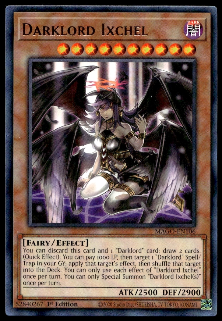 This card, from 2020 is part of the Yu-Gi-Oh! Maximum Gold (1st Edition) card set. Darklord Ixchel is featured and has a card number of MAGO-EN106.