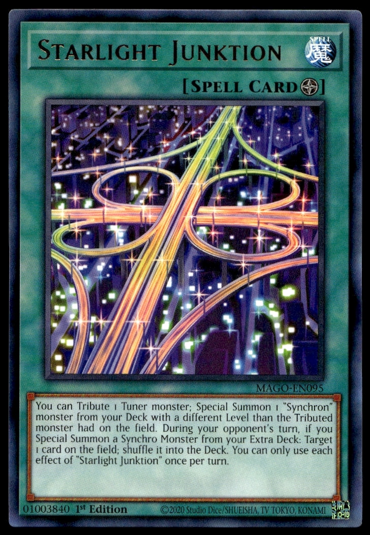 This card, from 2020 is part of the Yu-Gi-Oh! Maximum Gold (1st Edition) card set. Starlight Iunktion is featured and has a card number of MAGO-EN095.