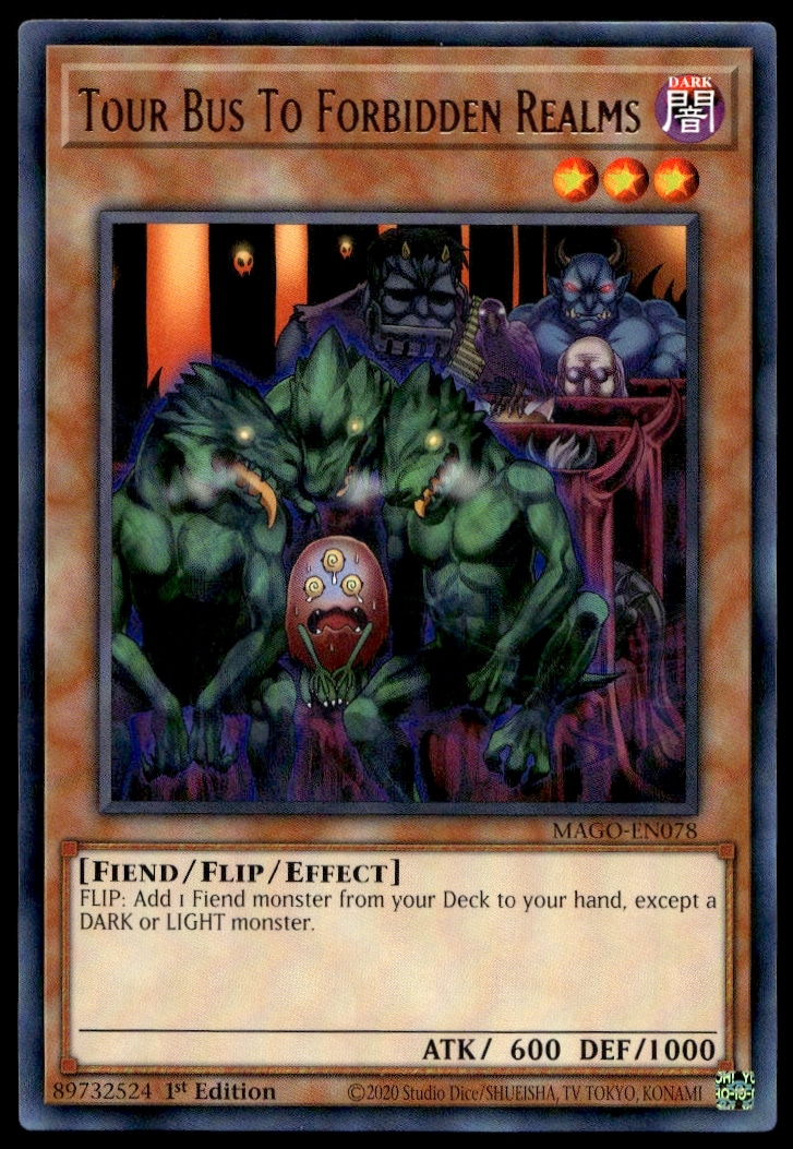 This card, from 2020 is part of the Yu-Gi-Oh! Maximum Gold (1st Edition) card set. Tour Bus To Forbidden Realms is featured and has a card number of MAGO-EN078.