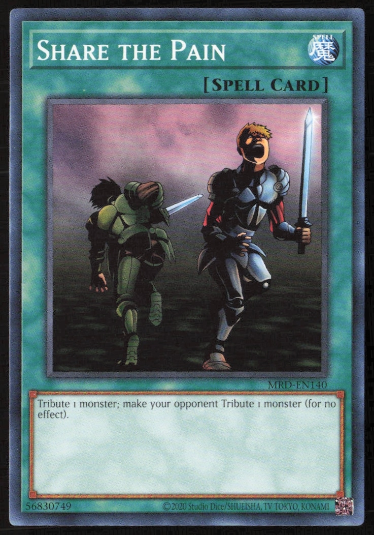 This Yu-Gi-Oh! card, from 2023 is part of the Yu-Gi-Oh! Metal Raiders (25th Anniversary Edition) card set. Share The Pain is featured and has a card number of MRD-EN140.