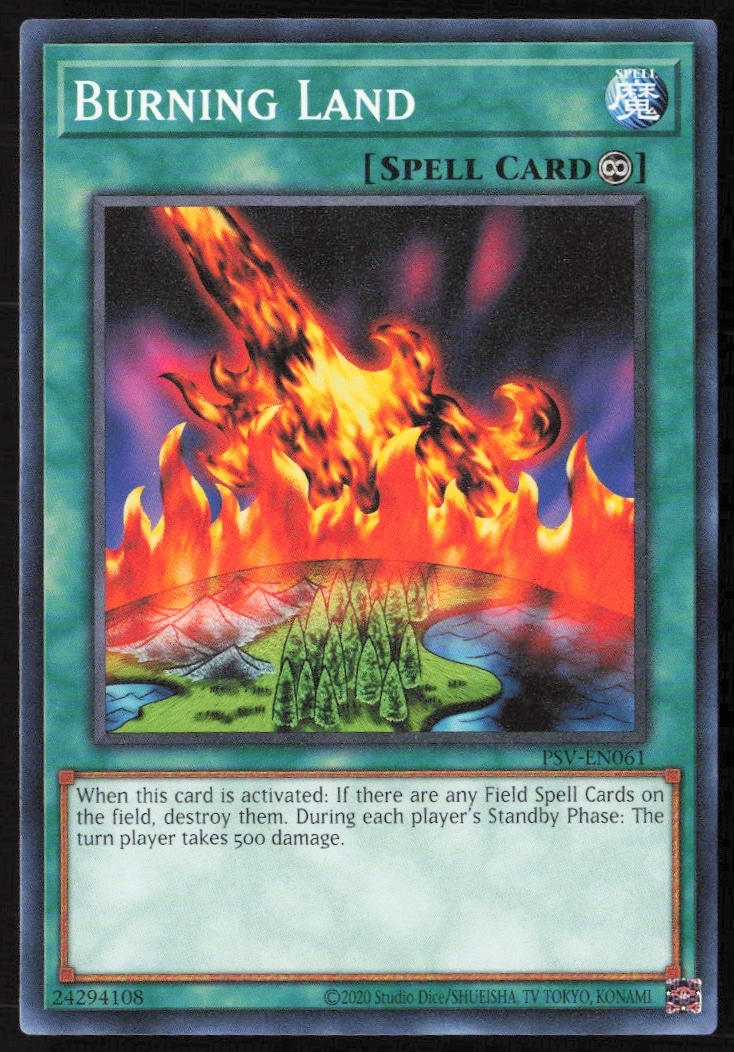 This Yu-Gi-Oh! card, from 2023 is part of the Yu-Gi-Oh! Pharaoh’s Servant (25th Anniversary Edition) card set. Burning Land is featured and has a card number of PSV-EN061.
