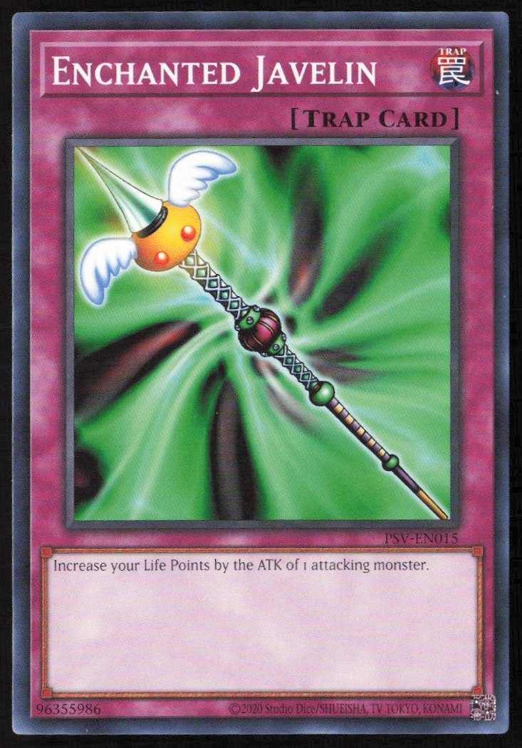 This Yu-Gi-Oh! card, from 2023 is part of the Yu-Gi-Oh! Pharaoh’s Servant (25th Anniversary Edition) card set. Enchanted Javelin is featured and has a card number of PSV-EN015.