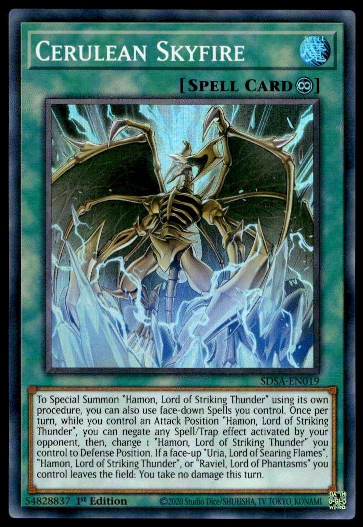 This card, from 2020 is part of the Yu-Gi-Oh! Structure Deck: Sacred Beasts (1st Edition) card set. Cerulean Skyfire is featured and has a card number of SDSA-EN019.