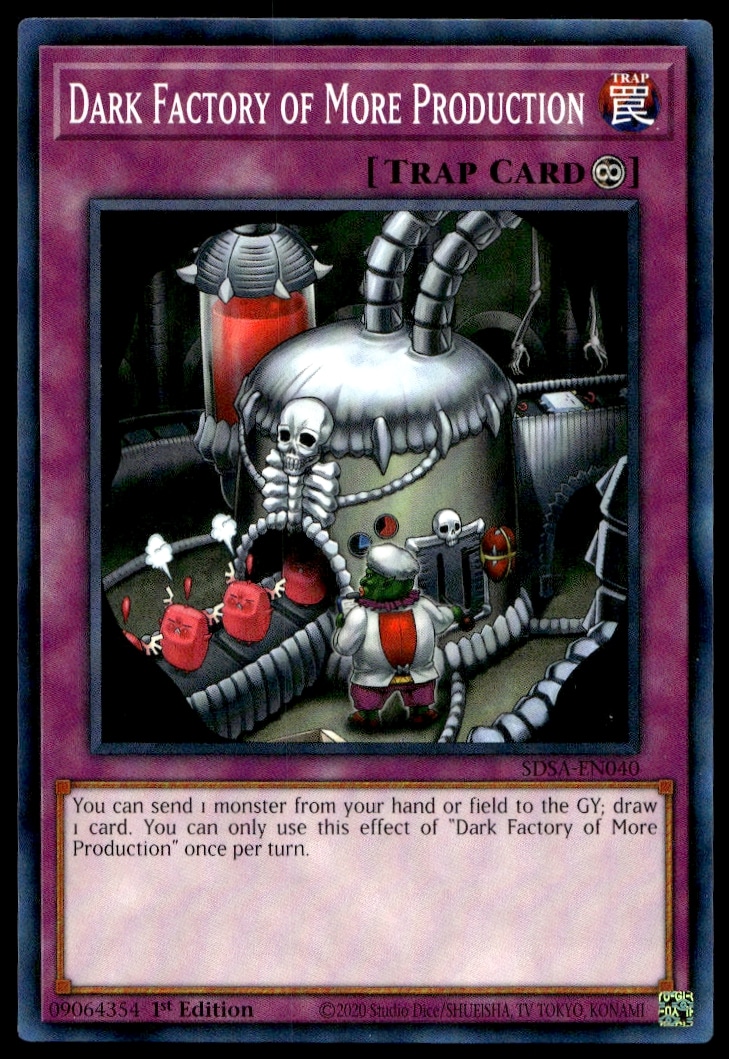 This card, from 2020 is part of the Yu-Gi-Oh! Structure Deck: Sacred Beasts (1st Edition) card set. Dark Factory of More Production is featured and has a card number of SDSA-EN040.