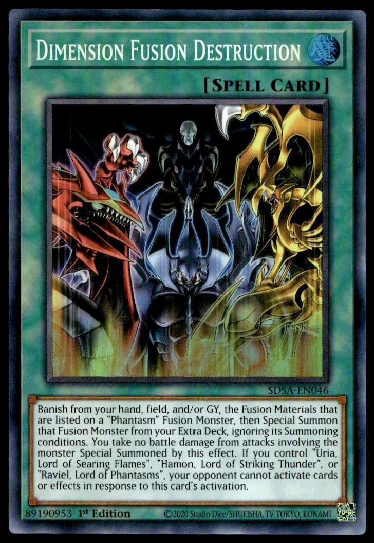 This card, from 2020 is part of the Yu-Gi-Oh! Structure Deck: Sacred Beasts (1st Edition) card set. Dimension Fusion Destruction is featured and has a card number of SDSA-EN046.