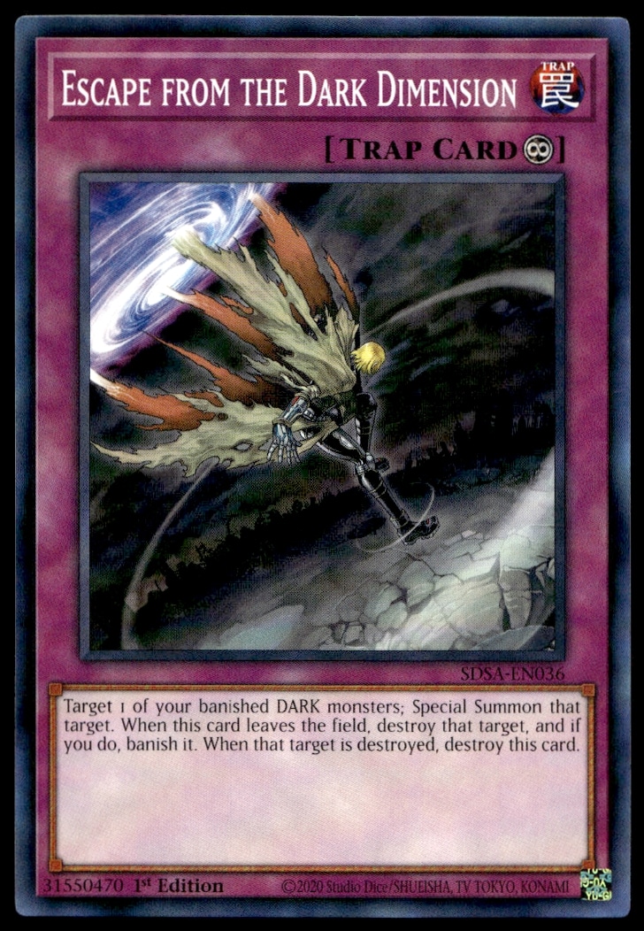 This card, from 2020 is part of the Yu-Gi-Oh! Structure Deck: Sacred Beasts (1st Edition) card set. Escape from the Dark Dimension is featured and has a card number of SDSA-EN036.