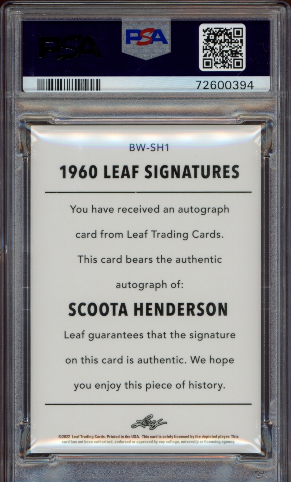 This ultra-rare 2021-22 Leaf Memories Scoota Henderson 1960 Leaf Signatures Red #BW-SH1 card is a must-have for any serious collector. This card is limited to only 25 ever produced, making it one of the most sought-after cards from the set. It has been professionally graded PSA 9 Mint, making it one of the highest graded Henderson signature cards in existence. Add this rare card to your collection and you won’t regret it!