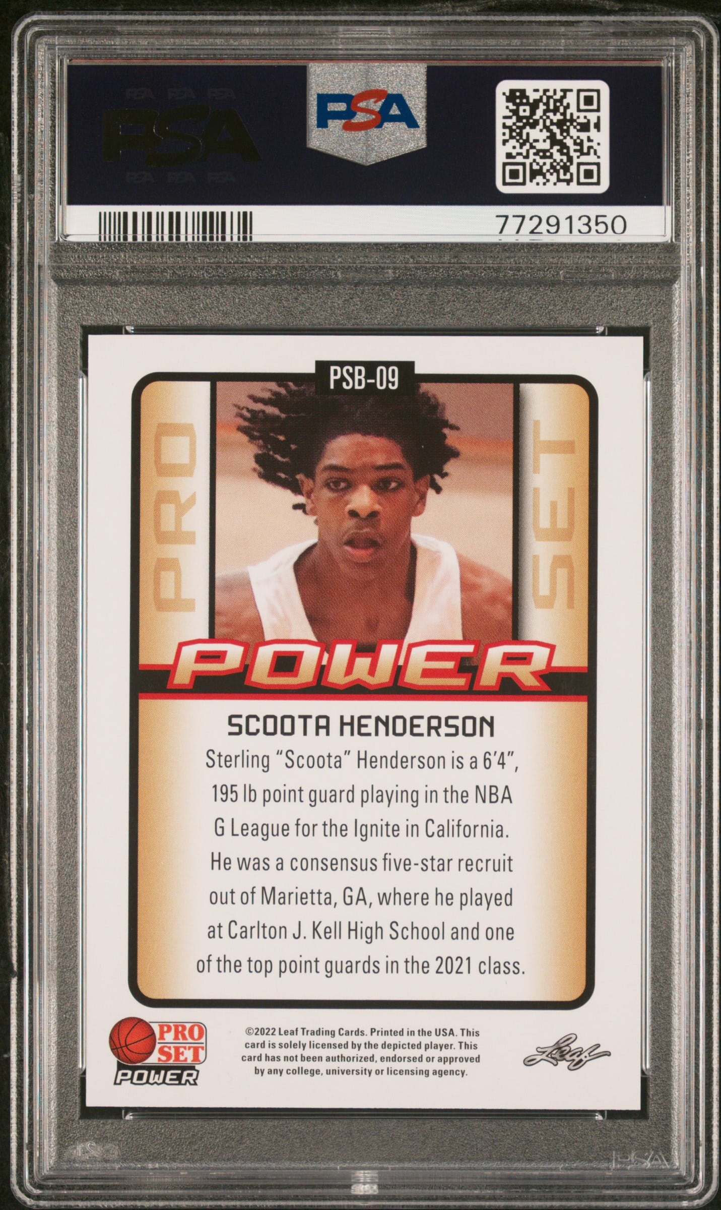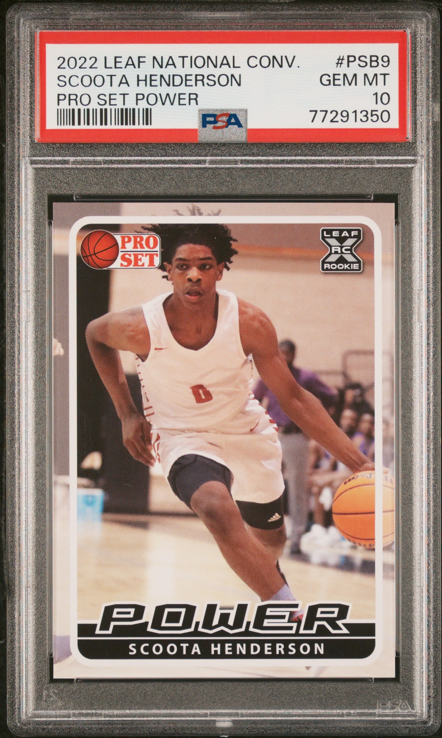 This Basketball card, from 2021-22 is part of the Leaf National Convention card set. Scoota Henderson is featured and has a card number of PSB-09. It is graded by PSA and has a numeric grade of 10.