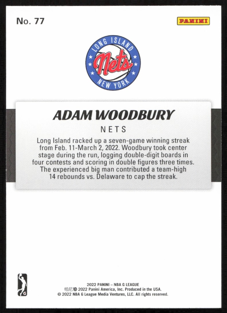 This Basketball card, from 2021-22 is part of the Panini NBA G League card set. Adam Woodbury is featured and has a card number of 77.