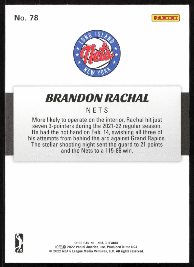 This Basketball card, from 2021-22 is part of the Panini NBA G League card set. Brandon Rachal is featured and has a card number of 78.