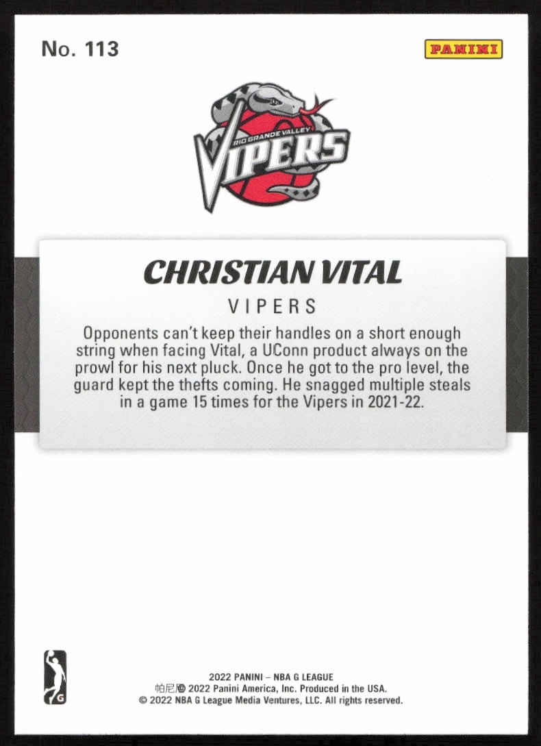 This BasketballΒ card, from 2021-22 is part of the Panini NBA G LeagueΒ card set. Christian Vital is featured and has a card number of 113.