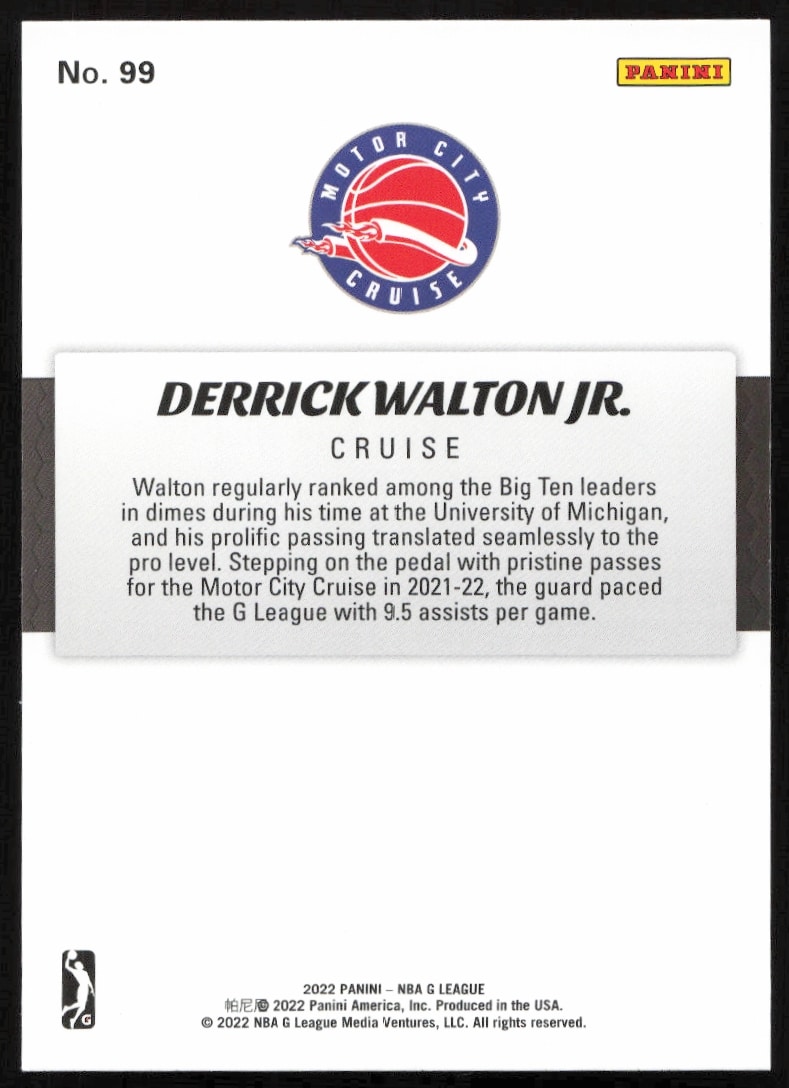 This BasketballΒ card, from 2021-22 is part of the Panini NBA G LeagueΒ card set. Derrick Walton Jr. is featured and has a card number of 99.