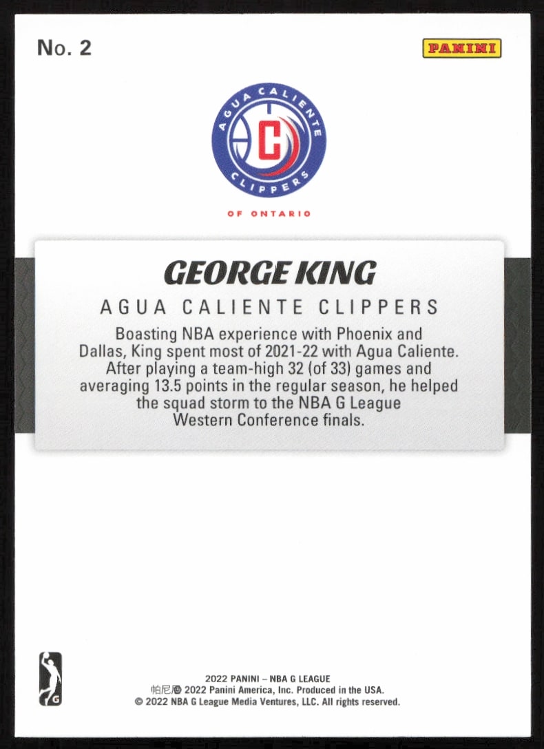 This BasketballΒ card, from 2021-22 is part of the Panini NBA G LeagueΒ card set. George King is featured and has a card number of 2.