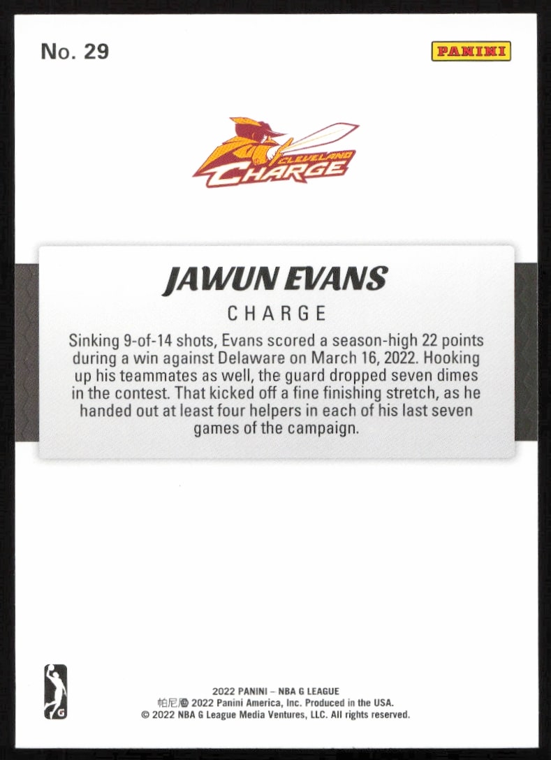 This BasketballΒ card, from 2021-22 is part of the Panini NBA G LeagueΒ card set. Jawun Evans is featured and has a card number of 29.