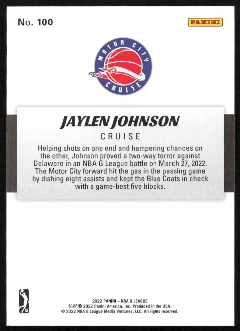 This BasketballΒ card, from 2021-22 is part of the Panini NBA G LeagueΒ card set. Jaylen Johnson is featured and has a card number of 100.