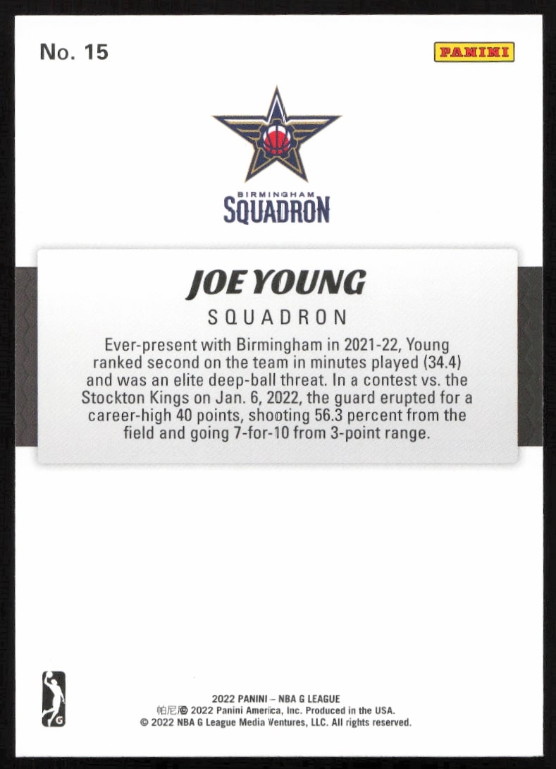 This BasketballΒ card, from 2021-22 is part of the Panini NBA G LeagueΒ card set. Joe Young is featured and has a card number of 15.