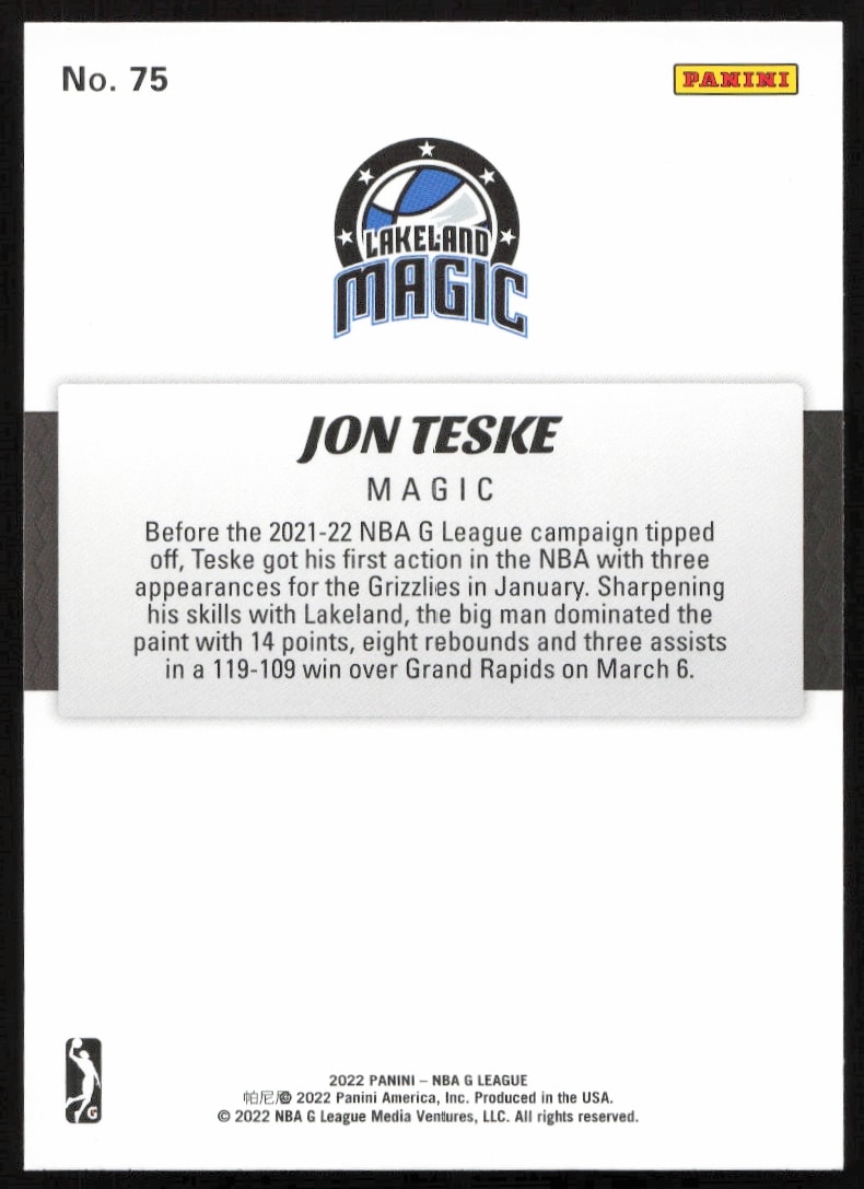 This BasketballΒ card, from 2021-22 is part of the Panini NBA G LeagueΒ card set. Jon Teske is featured and has a card number of 75.