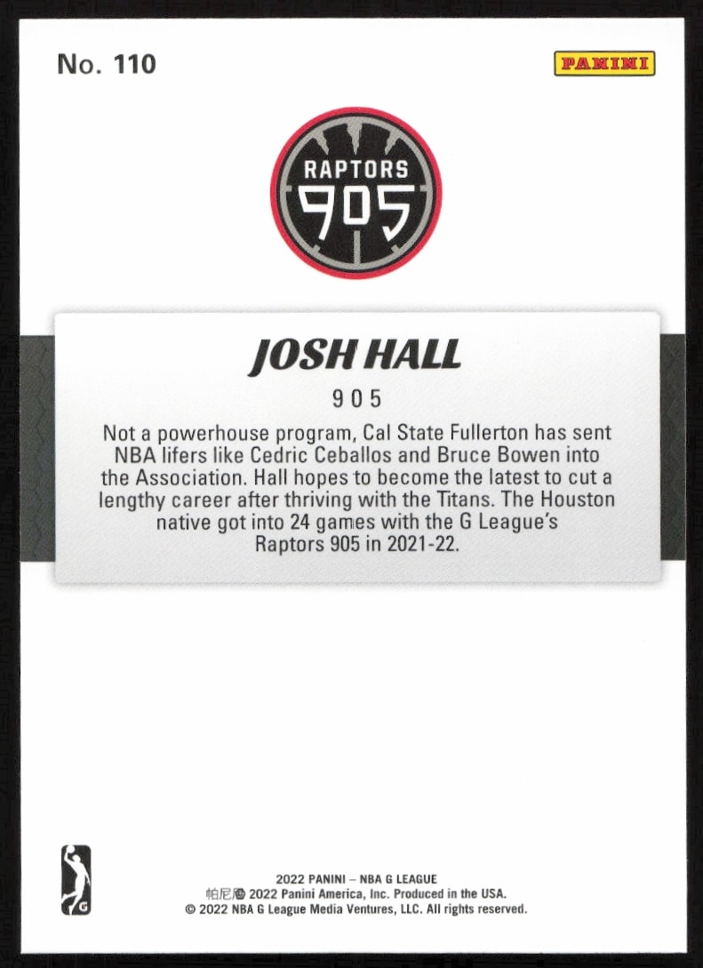 This BasketballΒ card, from 2021-22 is part of the Panini NBA G LeagueΒ card set. Josh Hall is featured and has a card number of 110.