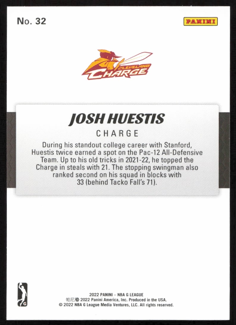 This BasketballΒ card, from 2021-22 is part of the Panini NBA G LeagueΒ card set. Josh Huestis is featured and has a card number of 32.