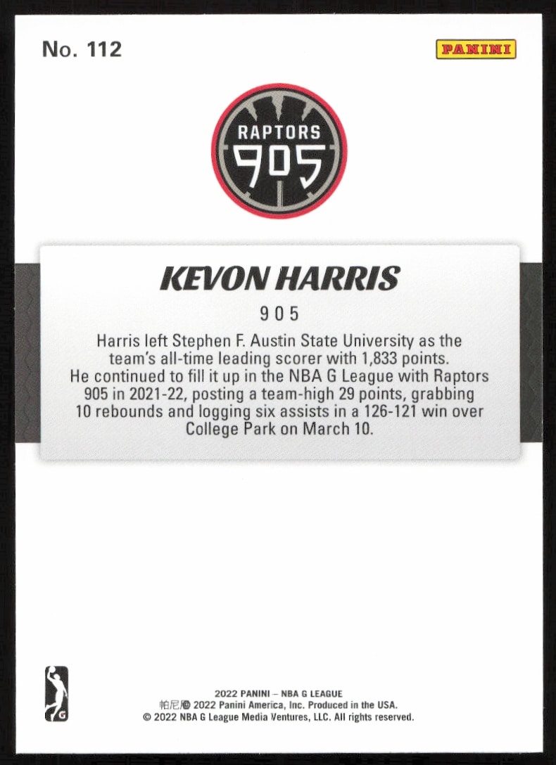 This BasketballΒ card, from 2021-22 is part of the Panini NBA G LeagueΒ card set. Kevon Harris is featured and has a card number of 112.
