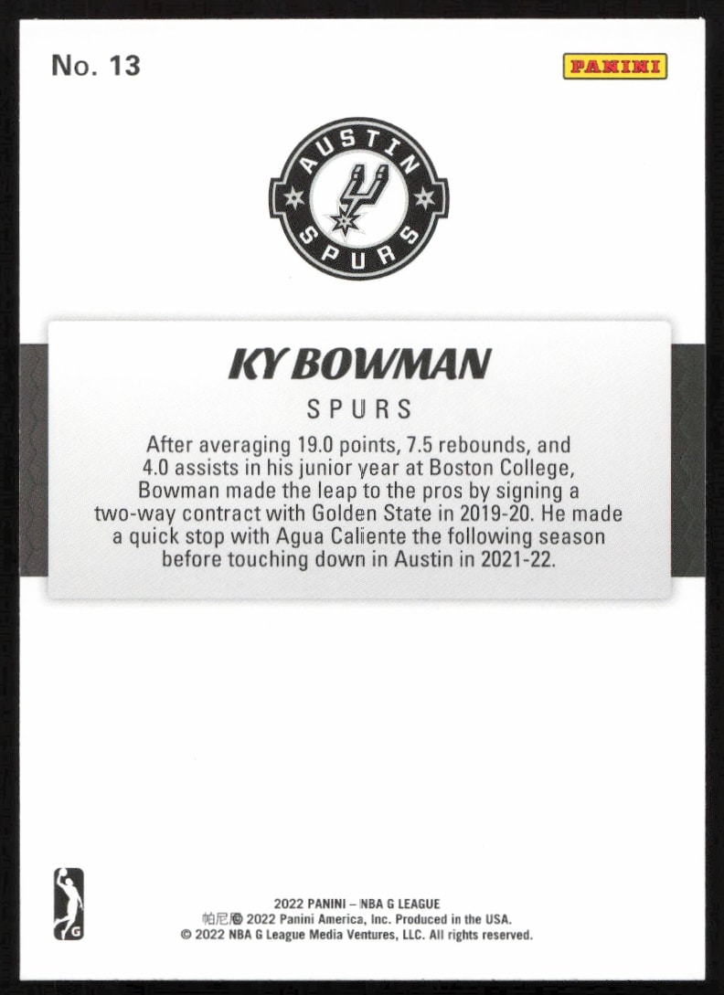 This BasketballΒ card, from 2021-22 is part of the Panini NBA G LeagueΒ card set. Ky Bowman is featured and has a card number of 13.