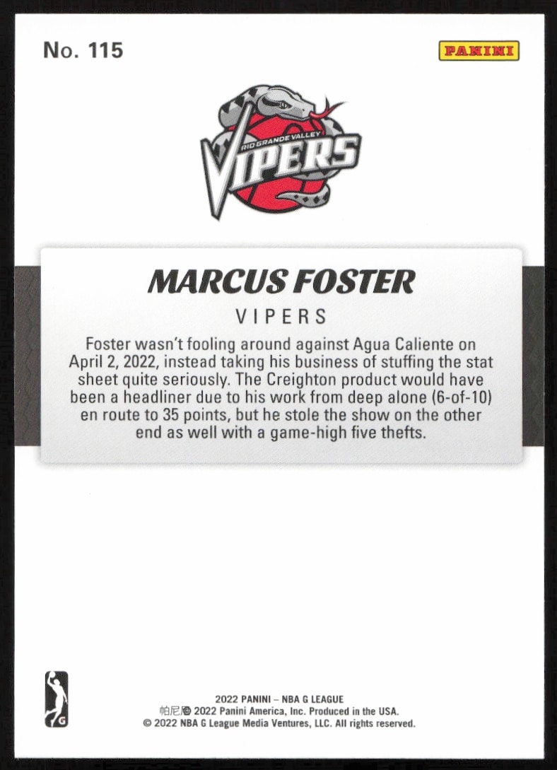 This BasketballΒ card, from 2021-22 is part of the Panini NBA G LeagueΒ card set. Marcus Foster is featured and has a card number of 115.