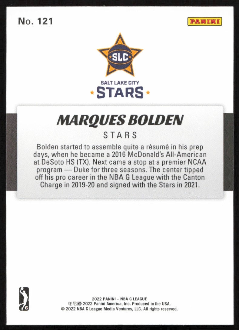 This BasketballΒ card, from 2021-22 is part of the Panini NBA G LeagueΒ card set. Marques Bolden is featured and has a card number of 121.