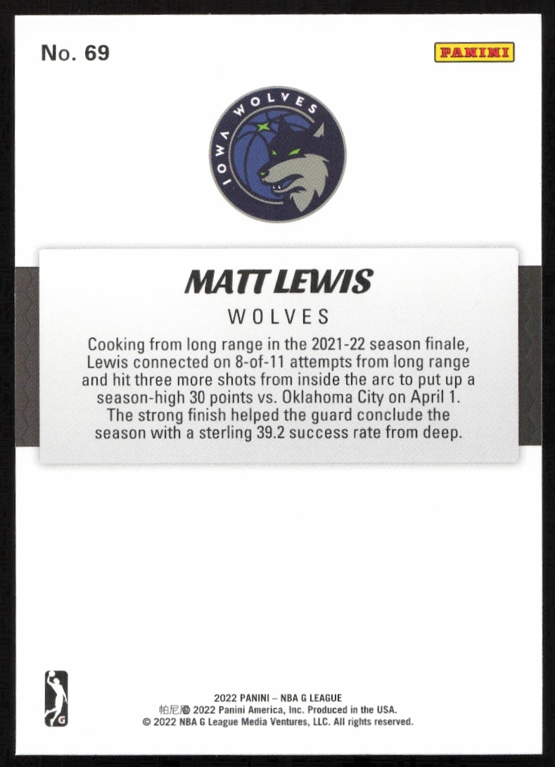 This BasketballΒ card, from 2021-22 is part of the Panini NBA G LeagueΒ card set. Matt Lewis is featured and has a card number of 69.