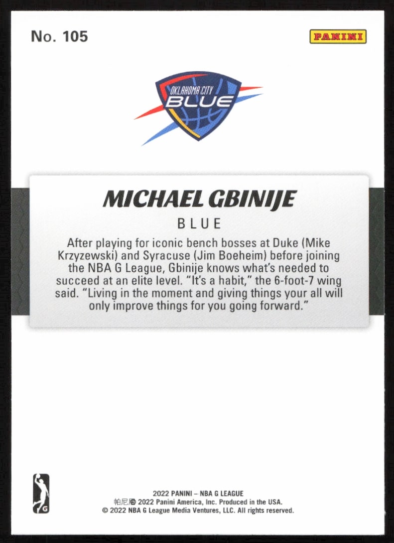 This BasketballΒ card, from 2021-22 is part of the Panini NBA G LeagueΒ card set. Michael Gbinije is featured and has a card number of 105.