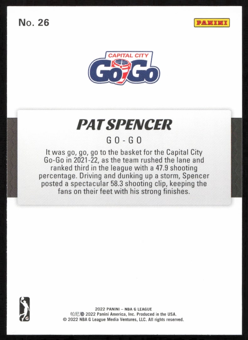 This BasketballΒ card, from 2021-22 is part of the Panini NBA G LeagueΒ card set. Pat Spencer is featured and has a card number of 26.