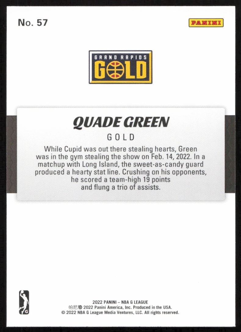 This BasketballΒ card, from 2021-22 is part of the Panini NBA G LeagueΒ card set. Quade Green is featured and has a card number of 57.