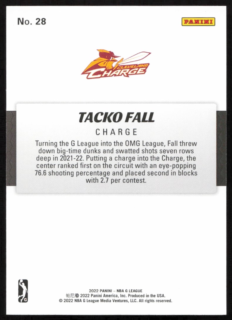 This BasketballΒ card, from 2021-22 is part of the Panini NBA G LeagueΒ card set. Tacko Fall is featured and has a card number of 28.