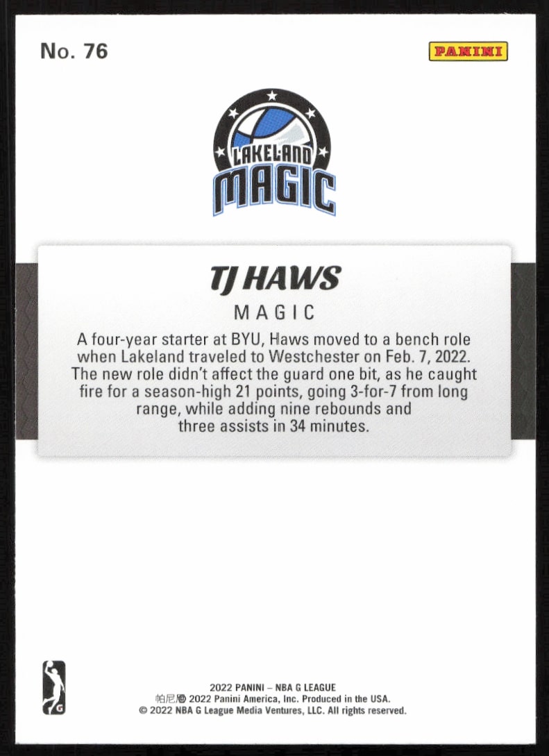 This BasketballΒ card, from 2021-22 is part of the Panini NBA G LeagueΒ card set. TJ Haws is featured and has a card number of 76.