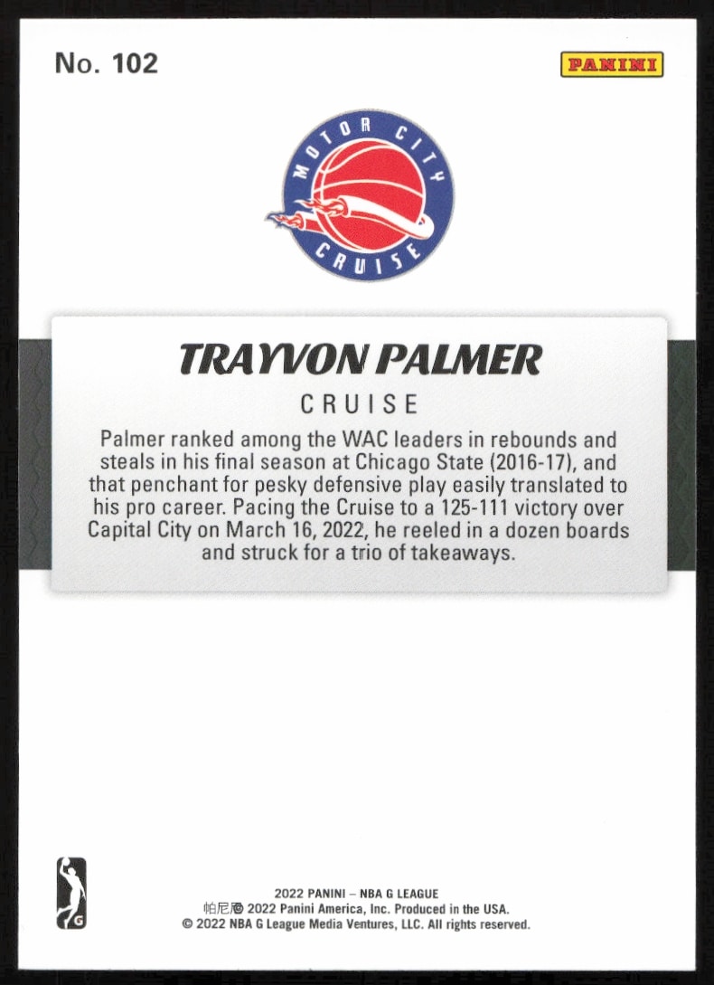 This BasketballΒ card, from 2021-22 is part of the Panini NBA G LeagueΒ card set. Trayvon Palmer is featured and has a card number of 102.