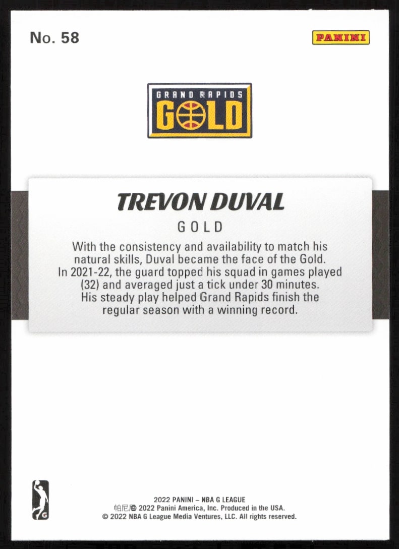 This Basketball card, from 2021-22 is part of the Panini NBA G League card set. Trevon Duval is featured and has a card number of 58.