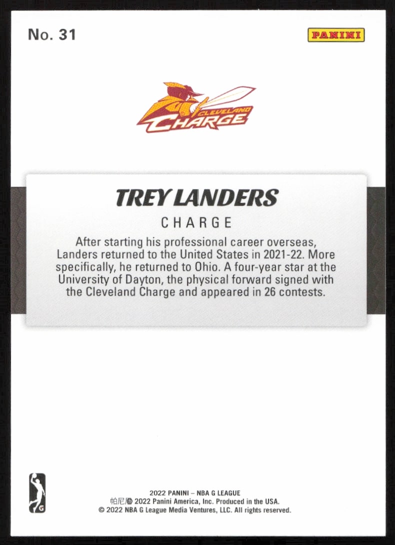 This BasketballΒ card, from 2021-22 is part of the Panini NBA G LeagueΒ card set. Trey Landers is featured and has a card number of 31.