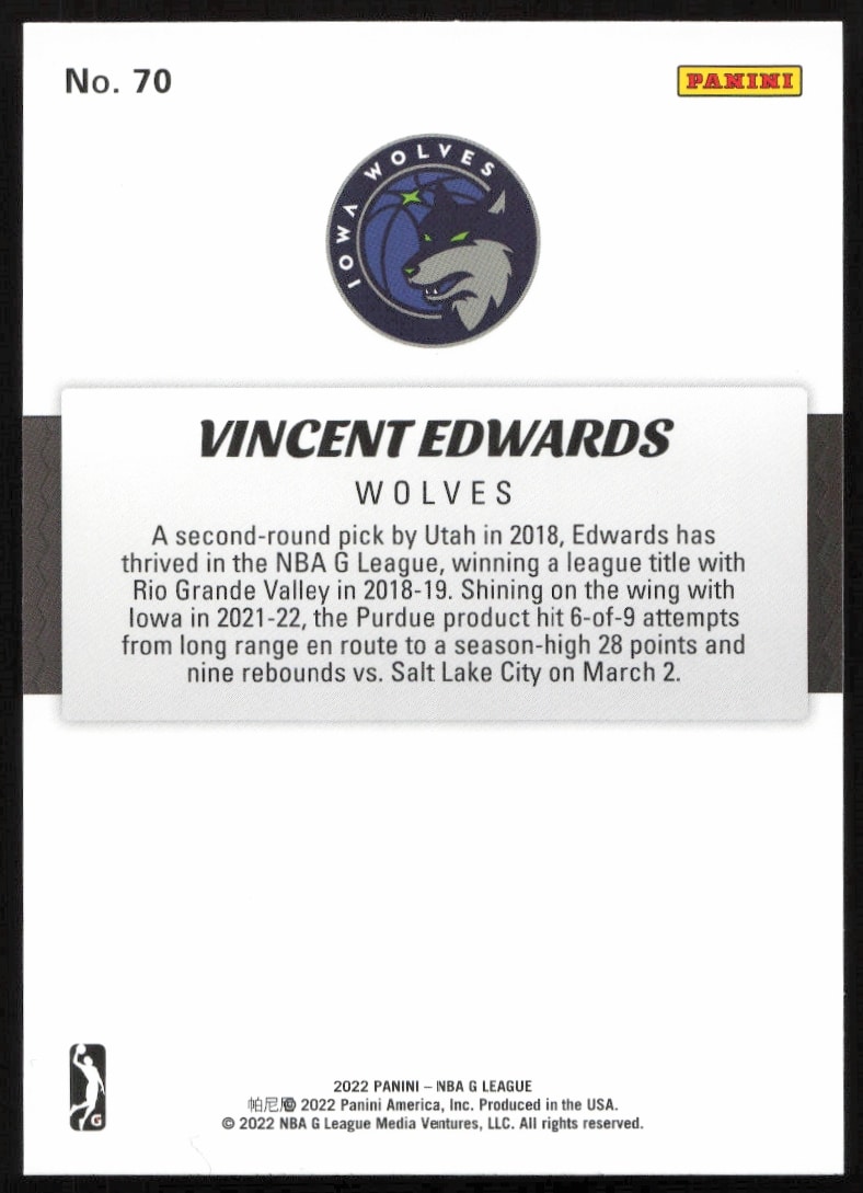 This BasketballΒ card, from 2021-22 is part of the Panini NBA G LeagueΒ card set. Vincent Edwards is featured and has a card number of 70.